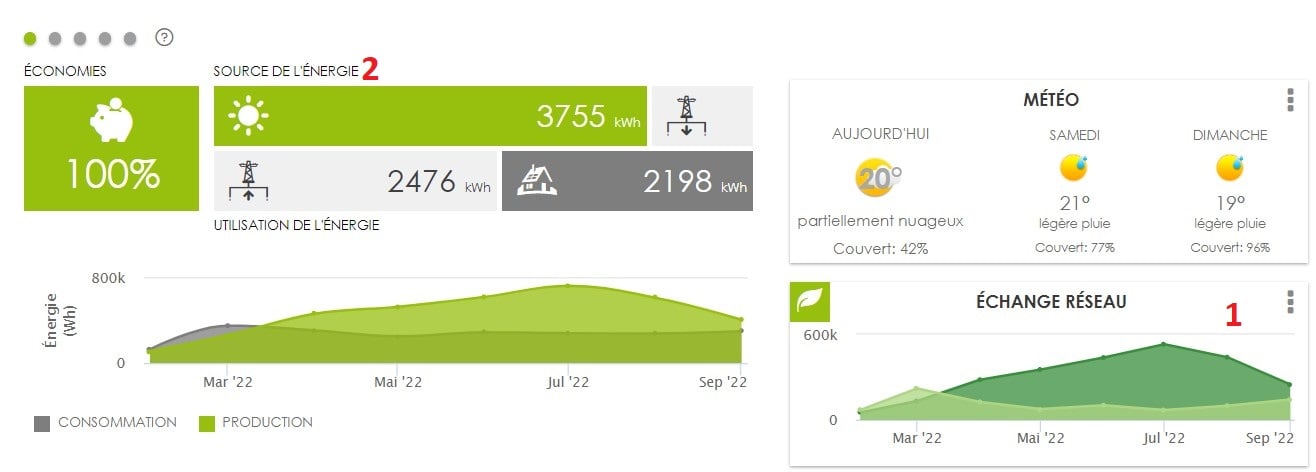 Une fois connecté à votre compte, vous pouvez facilement visualiser ces échanges depuis la tuile Echange Réseau (1), ou depuis les indicateurs clés dans le bloc "Sources de l'énergie" (2).