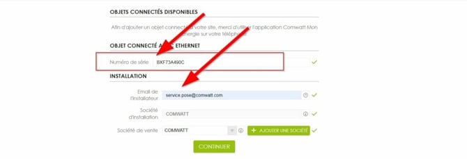 - Saisissez le numéro de la Box, ainsi que l’adresse mail installateur et le nom de la société qui vous a vendu votre gestionnaire d'énergie (inscrit sur votre facture).
