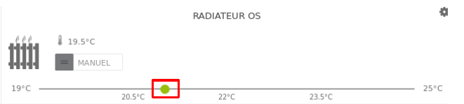 La température de consigne est indiquée par un point vert,  il s'agit de la température à laquelle vous souhaitez chauffer la pièce. En mode  MANUEL, vous pouvez changer la température de consigne en déplaçant le point vert ou en appuyant sur les boutons + et - de votre vanne.