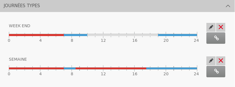 Connectez-vous à votre interface Comwatt puis cliquez sur l’onglet “PLANNING”. Vous pourrez alors définir une planification pour adapter la température de la pièce selon vos habitudes, et ainsi réaliser des économies. Vous pouvez par exemple baisser la température pendant la nuit et l'augmenter à l’heure de votre réveil ou à votre retour du travail. Exemple de journée type :